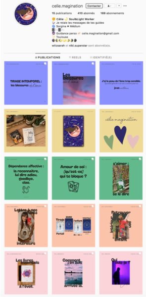 Je pense que guider les gens fait partie de ma mission, que ce soit avec des cartes ou avec des esprits. Je partage sur mon compte Instagram @celie.magination tout ce que j’aurai aimé savoir en débutant. Une fois que j’ai choisi ma charte graphique, je n’ai plus qu’à faire mes mises en page sur Indesign. Je parle alors de développement personnel de manière générale : les blessures de l’âme, l’amour de soi, notre enfant intérieur…